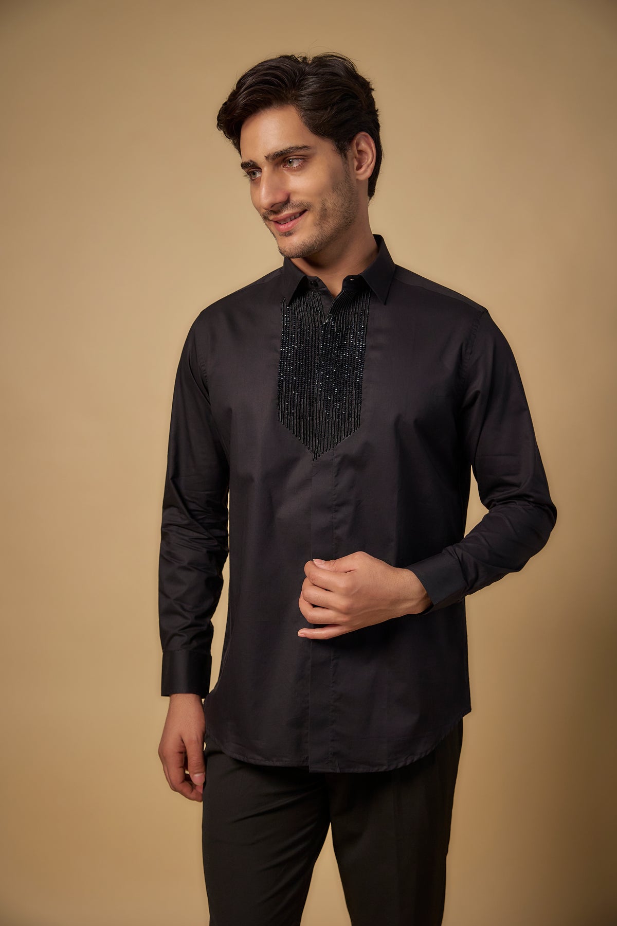 Featuring a black shirt in pure satin cotton base with cutdana hand embroidery. Style it with pants and shoes for a festive evening, intimate celebration or elevated day occasion.