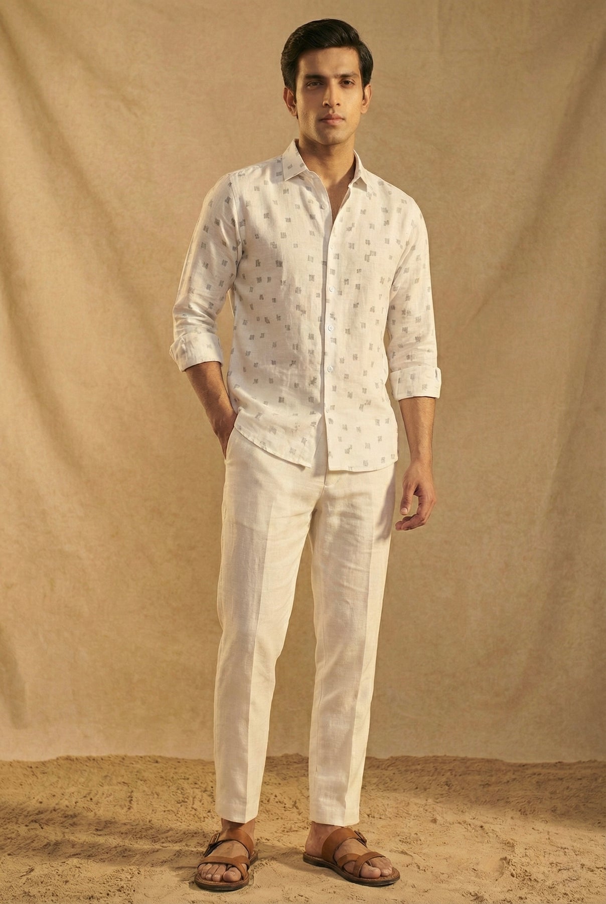 Elegant in its simplicity, this Ivory Printed Linen Shirt is designed for the modern man who values refined detailing. Crafted from premium breathable linen, the shirt features subtle woven geometric motifs that add depth and sophistication while maintaining a clean, minimalist aesthetic.